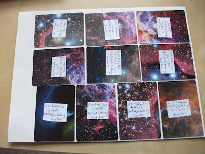 To some people, the back of the ATC is half the art, but I don’t see it that way. I like the backing to be somewhat nice, but if it’s just white (or white paper with colored pencil shading), that’s fine too. Recently I acquired a NASA planner from 2009 as a freebie somewhere, so I used a few of the nifty galaxy and nebula photos for my ATC backs. The back also generally includes all the information about the card. I haven’t found any official rules about what to include (indeed, the only “official” rule is the size), but generally I write “Artist Trading Card” at the top, then my name (well, melydia, anyway) and the date and usually my URL. If the art has a title, I’ll put that. If it’s for a swap, I’ll put the swap name. That’s about it. I haven’t quite figured out what an “artist’s signature” is, as I always sign the image on the front of the card.